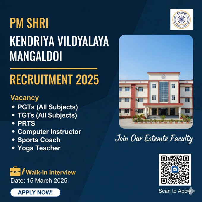 PM SHRI Kendriya Vidyalaya Mangaldoi has announced a walk-in interview for the recruitment of Vocational Instructor (ATL Lab) for the academic session 2025–26. This is an excellent opportunity for qualified professionals to join the PM SHRI Scheme and contribute to an innovative and skill-oriented learning environment.